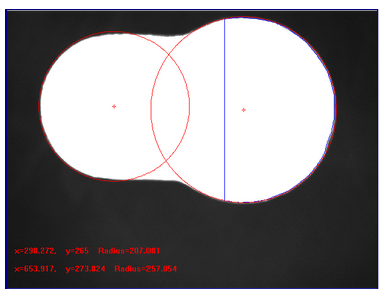 圖3:圖中兩個紅色的圓形是通過系統檢測程序,根據工件外形尺寸求出的擬合圓