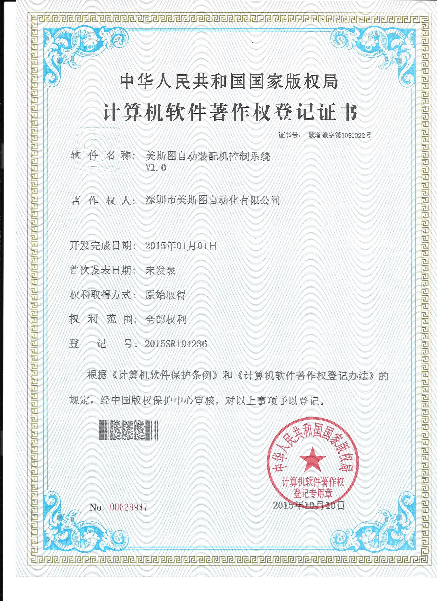 運動控制事業部獲得了《美斯圖自動裝配機控制系統V1.0》軟件著作權。2014-2015年中期間,美斯圖自動化公司共申請了發明專利三項,實用新型專利十項,軟件著作權八個。期待美斯圖公司的技術團隊獲得更多的技術榮譽!