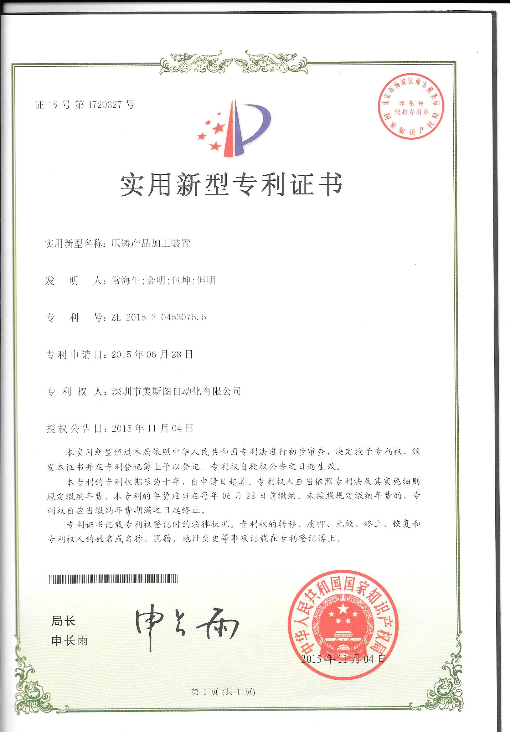 2015年11月13日,我司機器人事業部申報的《壓鑄產品加工裝置》實用新型專利獲得中國國家知識產權局授權。
