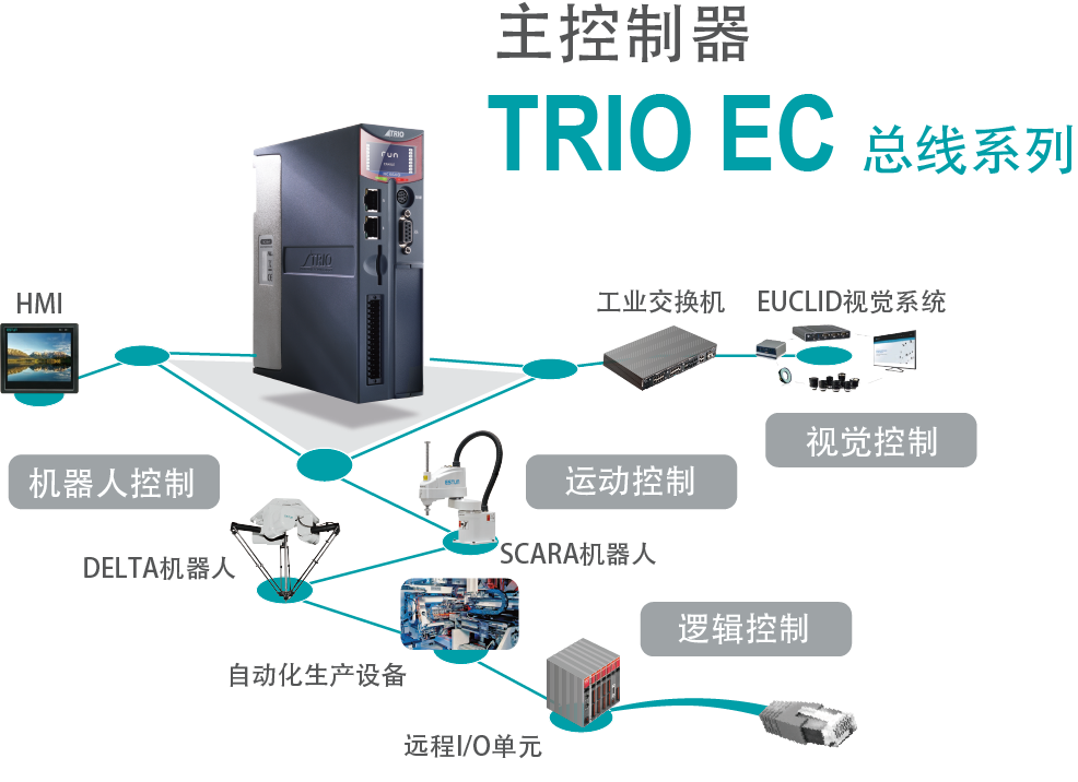 方案核心基于ESTUN的TRIO控制器平臺,將ESTUN機器人、交流伺服系統、視覺系統等集合在一起,實現一個控制器協同控制多臺機器人、伺服軸、視覺系統、邏輯控制。